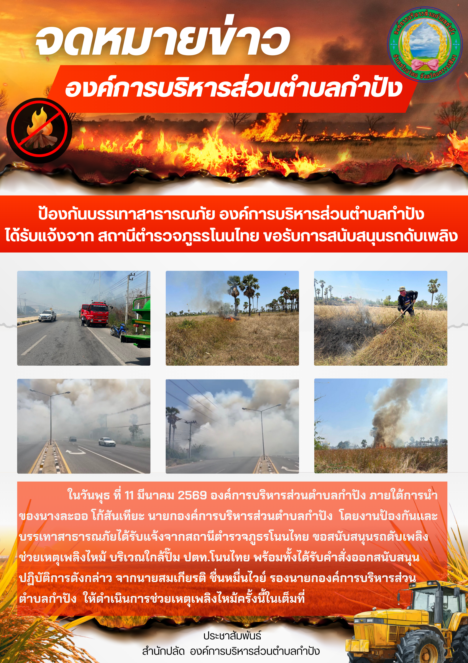 ป้องกันบรรเทาสาธารณภัย องค์การบริหารส่วนตำบลกำปัง ได้รับแจ้งจาก สถานีตำรวจภูธรโนนไทย ขอรับการสนับสนุ |